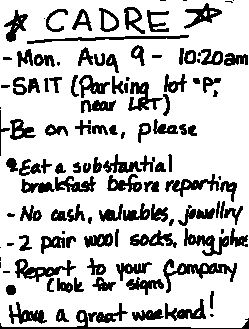 Rain prevented the extras from going anywhere until midnight; a brief respite in the weather allowed them to march to another tent set up nearer to the trench set. While the cast walked around in parkas and warm boots, the extras were left to shiver in thin wool tunics and garbage bags. Seeking refuge in the smaller tent, this author was able to chat with a fellow Crescent Heights High School alum, who swapped stories about the reserves with him; Channing Knull had been a naval reservist while the author was an army reservist.