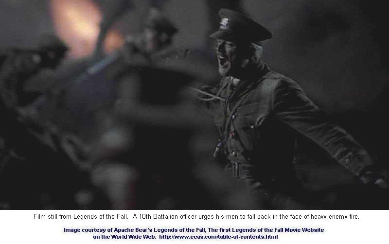 including one where the soccer ball comes to rest by a dead Canadian. For most of the cadre men of "G" Company, this spelled the end of filming. Those members of the Calgary Highlanders who stayed on the set with "G" Company throughtout the shoot, and whose images are reproduced on these pages, include Sergeant Dennis Russell, CD, Corporal Michael Dorosh, Corporal William Bailie, Private Michael McAdam, Private Michael O'Connor, Private Kelly St. Jean, Private Jason Sartor, Private Justin Barrett and Private Jeremy Barrett. Wednesday 11 January 1995 On January 11, 1995, Legends of the Fall had its premiere in Calgary. Held in a small theatre in downtown Calgary, no Hollywood stars or dignitaries were present, though His Worship, Mayor Al Duerr said a few words, and the Calgary Highlanders Pipes and Drums performed before the viewing. Those who had been extras expressed surprise, as Andrew Burden did in the newpaper article above, at how little of their work appeared in the final version of the film. The movie was discussed over drinks at the Elephant and Castle afterwards, with a reunion of sorts occurring between the cadre men and several other of the "G" Company extras who had been invited to the premiere. A not unrewarding part of the evening had been receiving a "Good Job" from the mayor as he walked out of the theatre, who recognized the author's band uniform. But it is also rewarding to know that in some small way, the actions of Canada's army in World War One has been represented on film for a mass audience, and even if those actions were not the focus of the film, if nothing else, a weary group of extras gained a small glimmer of appreciation for the miseries suffered by the CEF in France and Flanders. |